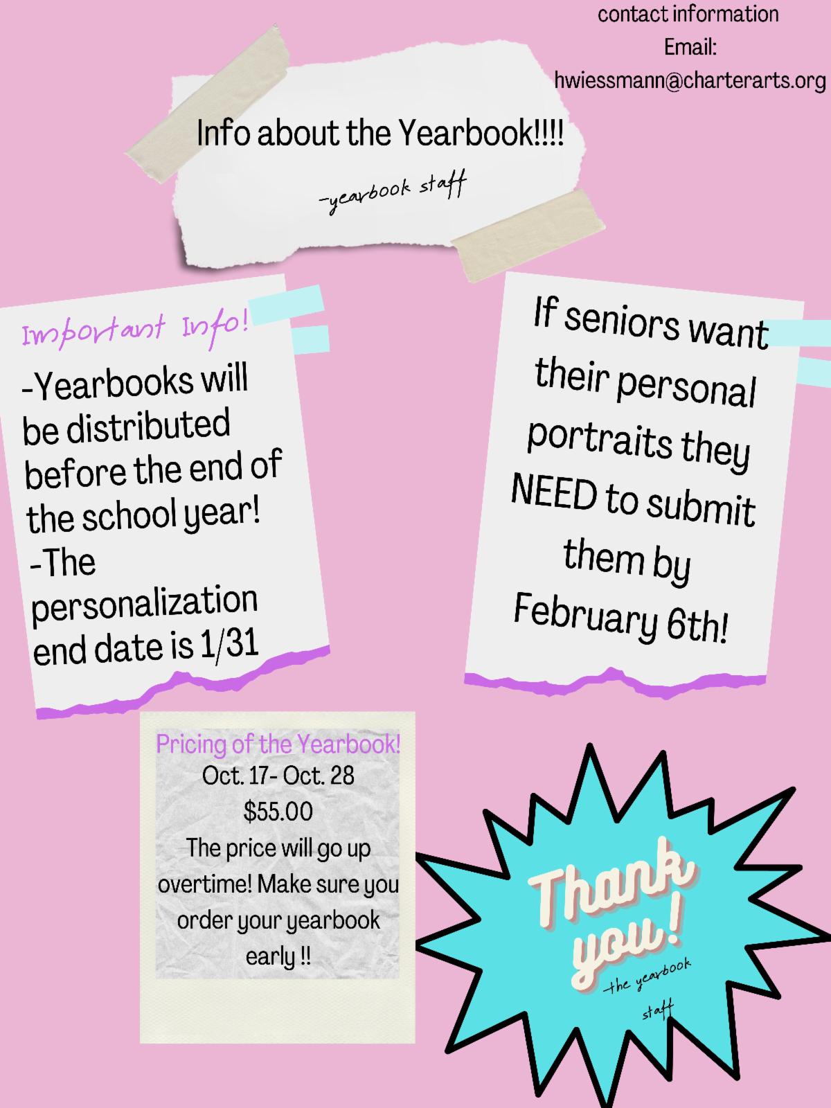 Ordering a Yearbook: .The 2025-2026 yearbook is a great way to keep those special Charter Arts memories fresh and vivid. Don’t miss out on getting one and keep those memories alive for years to come!